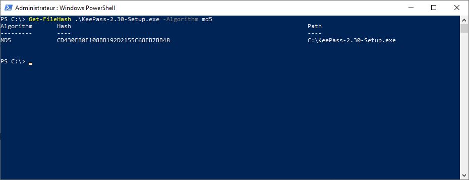 Si vous avez un système Windows récent avec PowerShell installé, vous avez probablement tout ce dont vous avez besoin pour vérifier le hachage MD5. C’est mon cas dans le cadre de mon travail, j’utilise très régulièrement PowerShell.