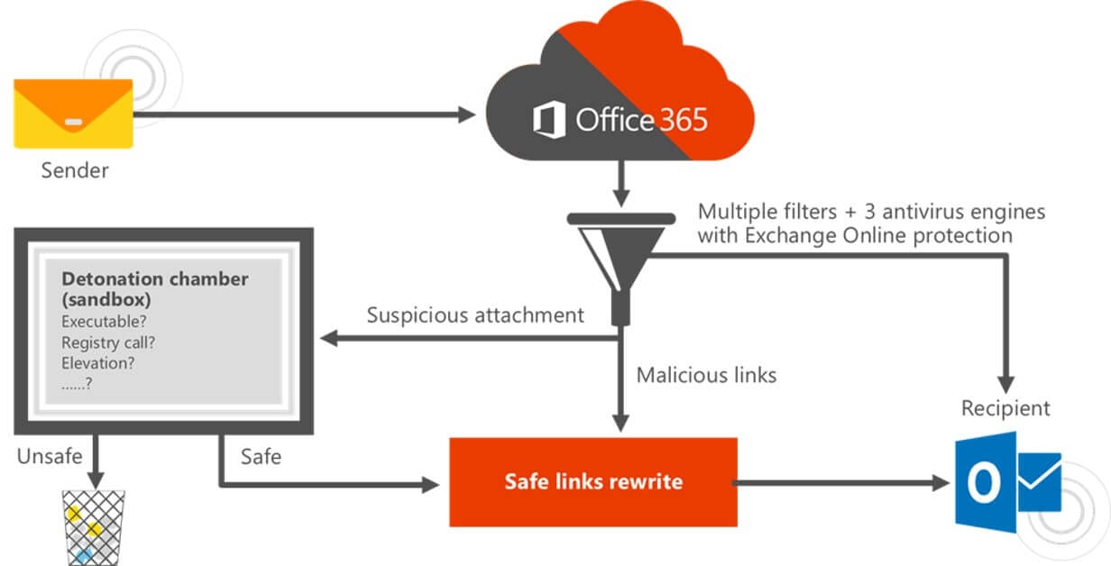 La fonction ATP Safe Attachments vérifie toutes les pièces jointes et analyses des e-mails pour confirmer si elles sont sûres ou malveillantes. Si elle s’avère malveillante, la stratégie est définie pour prendre les mesures appropriées pour la protection des données dans votre organisation. Ces stratégies ATP Safe Attachments sont configurées par votre administrateur global Office 365 ou vos administrateurs de sécurité. Les pièces jointes sécurisées ne sont pas uniquement réservées à Exchange. La protection peut être étendue à SharePoint Online, OneDrive Entreprise et Microsoft Teams.