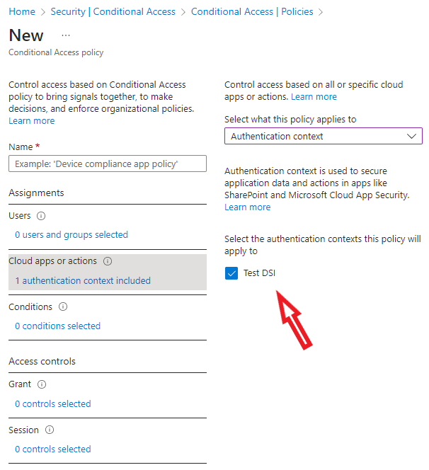 Pour commencer, accédez à la section Accès conditionnel du centre d’administration Microsoft Entra et définissez un contexte d’authentification. La façon la plus simple de penser à un contexte d’authentification est de le considérer comme une balise pour marquer quelque chose à protéger avec une politique d’accès conditionnel. Dans ce cas, la balise associe certaines actions protégées à une stratégie. Lorsqu’Azure AD évalue les connexions, il sait qu’à chaque fois que des comptes dans le cadre de la stratégie tentent d’effectuer une action protégée, leur connexion doit respecter les conditions définies dans la stratégie. Un Tenant peut définir jusqu’à 25 contextes d’authentification à utiliser comme il le souhaite. Pour tester les actions protégées, j’ai créé un contexte d’authentification appelé Test DSI.