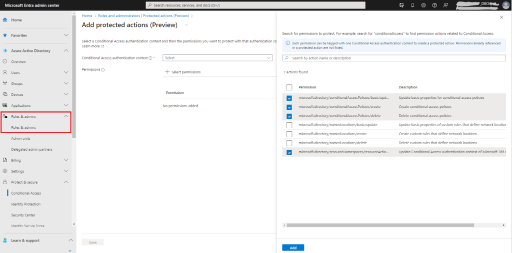 L’étape suivante consiste à ajouter des actions protégées au contexte d’authentification. Ouvrez la section Rôles et administrateurs du centre d’administration Entra et sélectionnez Actions protégées. Sélectionnez le contexte d’authentification, puis ajoutez des actions protégées (appelées autorisations dans l’interface graphique). Il vous suffit d’ajouter une seule action pour rendre la stratégie d’accès conditionnel efficace. J’ai choisi les quatre actions liées aux politiques d’accès conditionnel